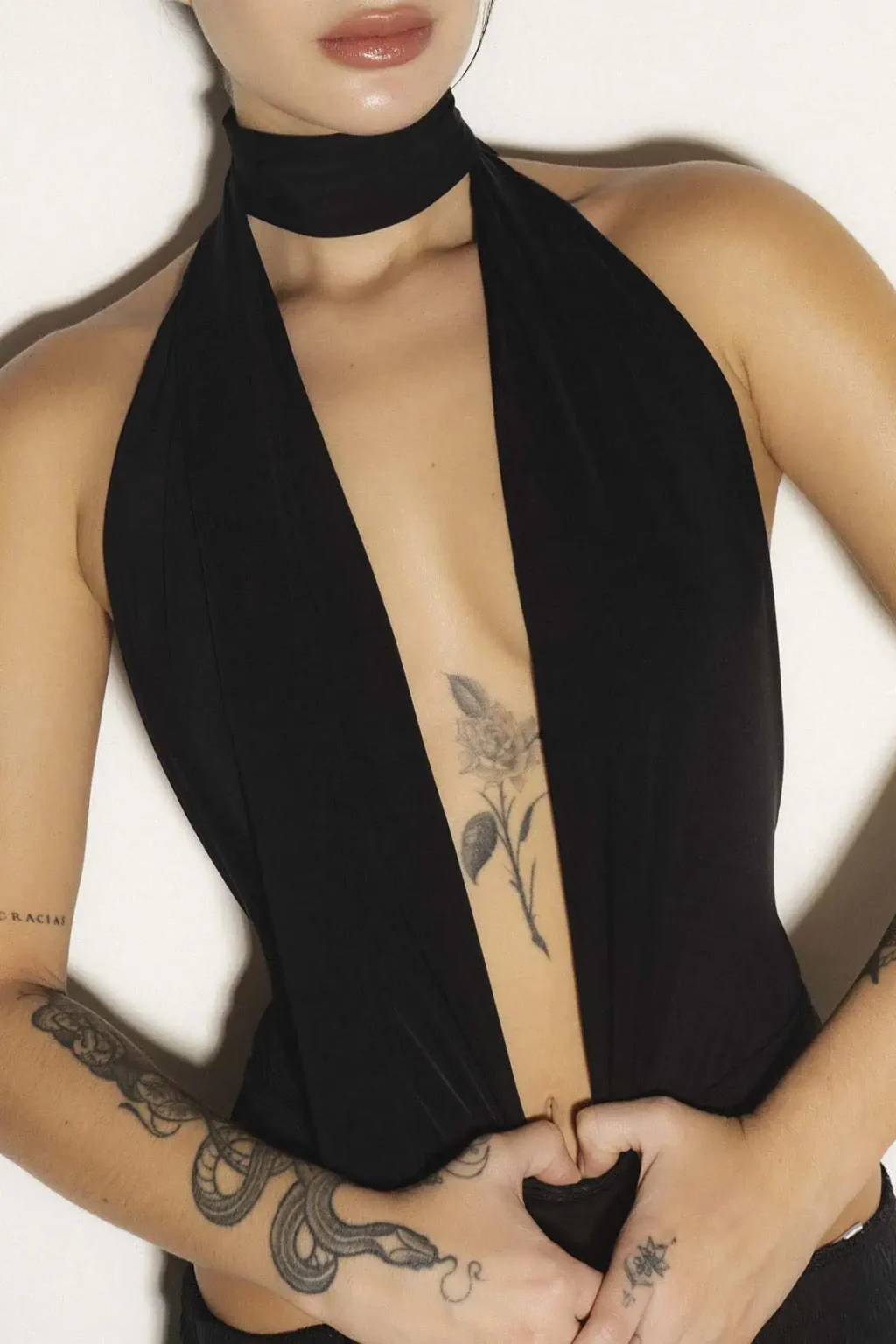 Body en tejido elastico suave que se ajusta al cuerpo con un fit impecable. Espalda descubierta y escote profundo que definen la silueta. Incluye una tira removible al cuello para transformar el look según el momento.