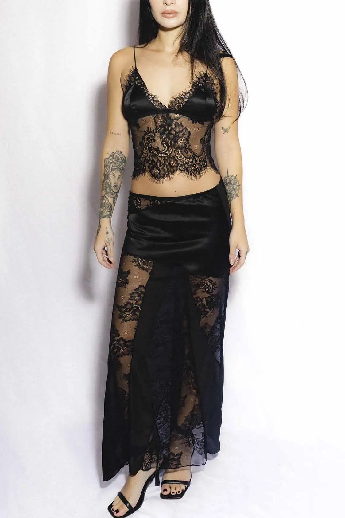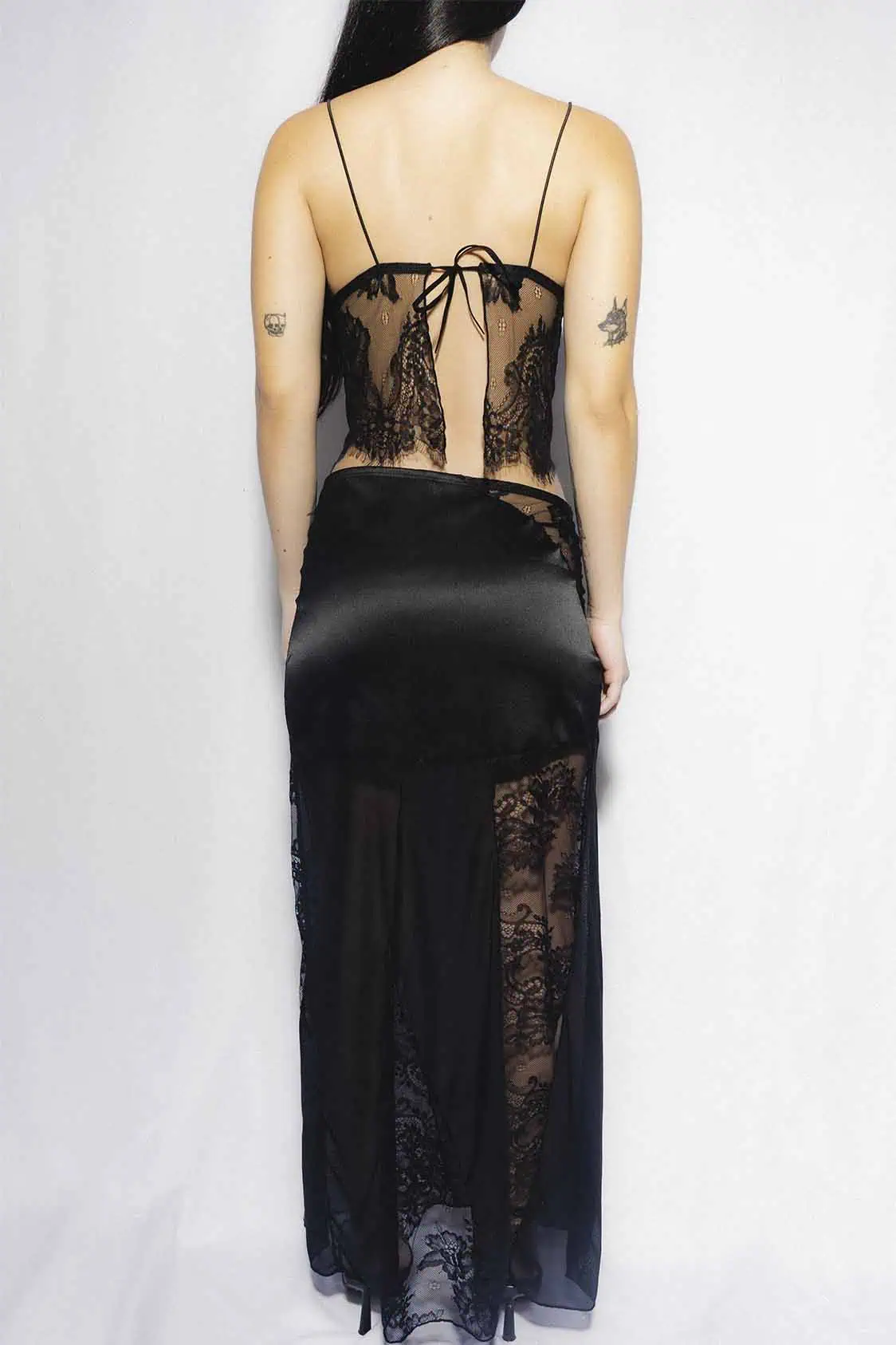 Falda larga en mezcla de encaje, mallatex y satín. Un contraste de texturas que aporta fluidez, estructura y un brillo sutil, creando una pieza sofisticada y llena de presencia.